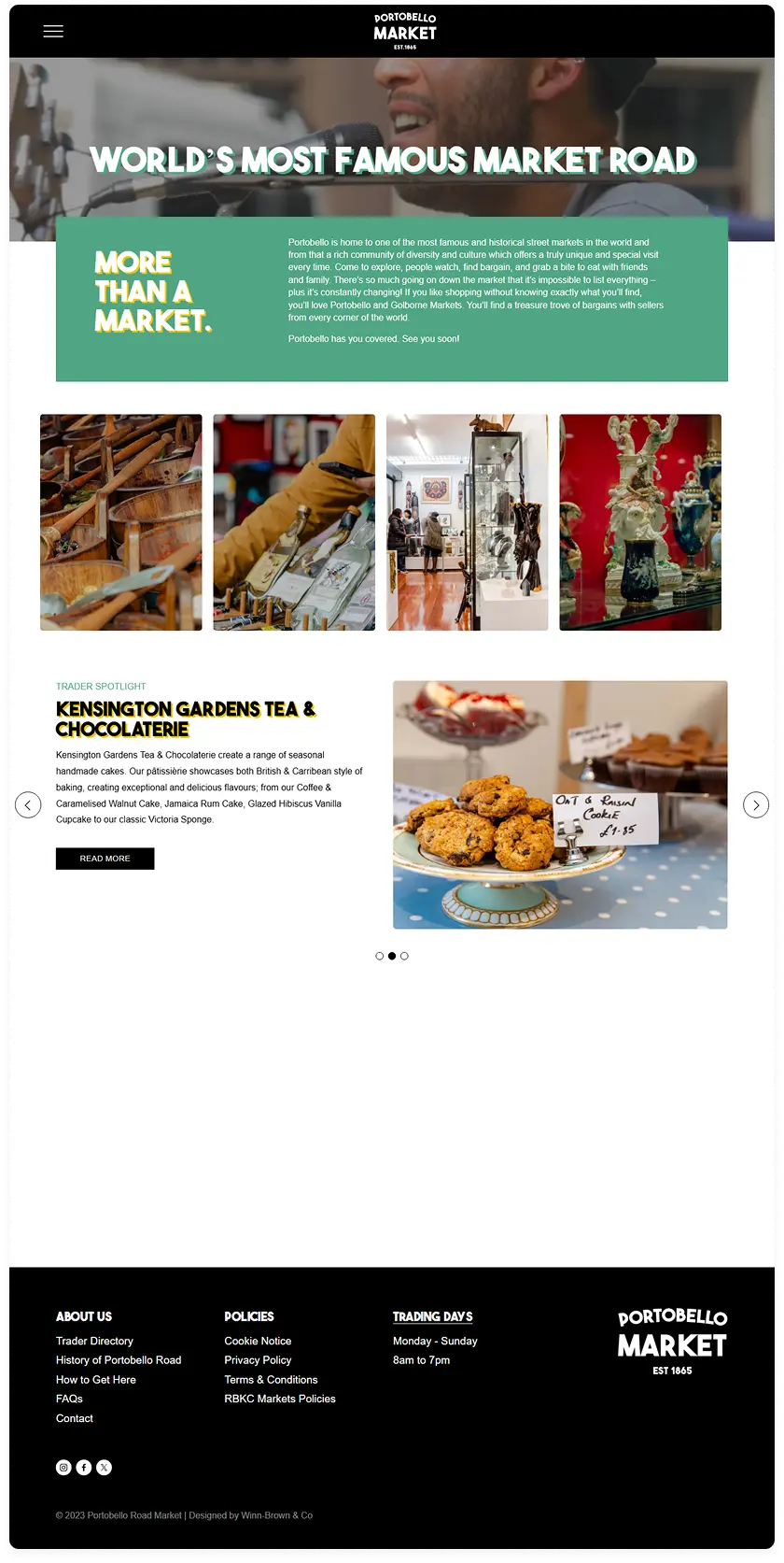 Visit Portobello is a digital platform showcasing the iconic Portobello Road Market in Notting Hill, London one of the world’s most historic and vibrant street markets. With over 150 years of heritage, it brings together antiques, fashion, food, art, and diverse local traders into a unified experience. The platform enables users to explore vendors, categories, and events through a structured and engaging interface, transforming the physical market into a rich digital journey for discovery, planning, and connection.